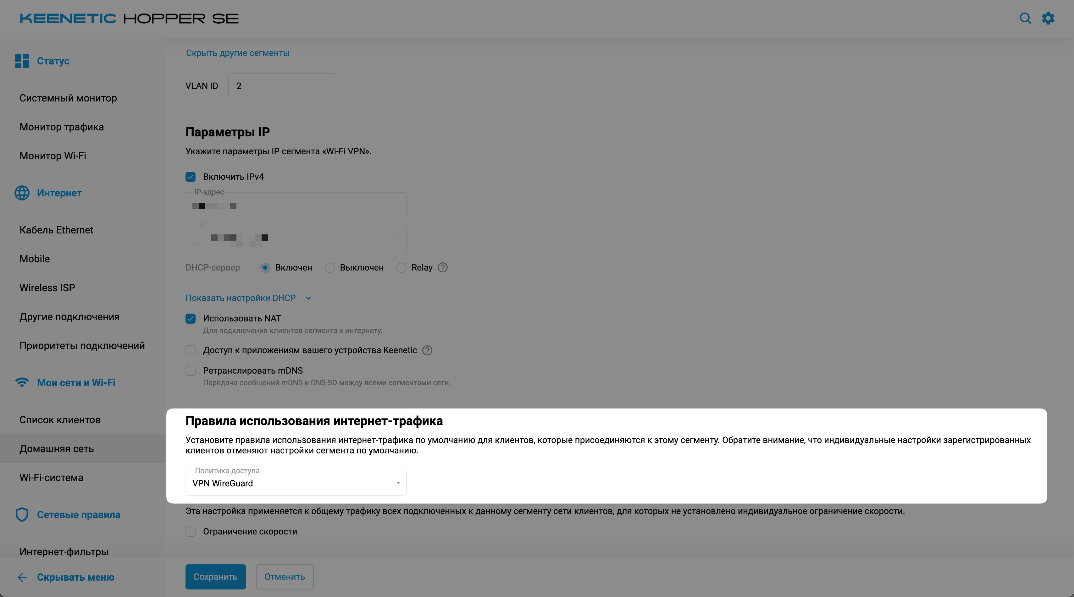 - Пролистайте вниз до раздела Правила использования интернет-трафика и выберите политику доступа с приоритетом VPN (например, WireGuard VPN).