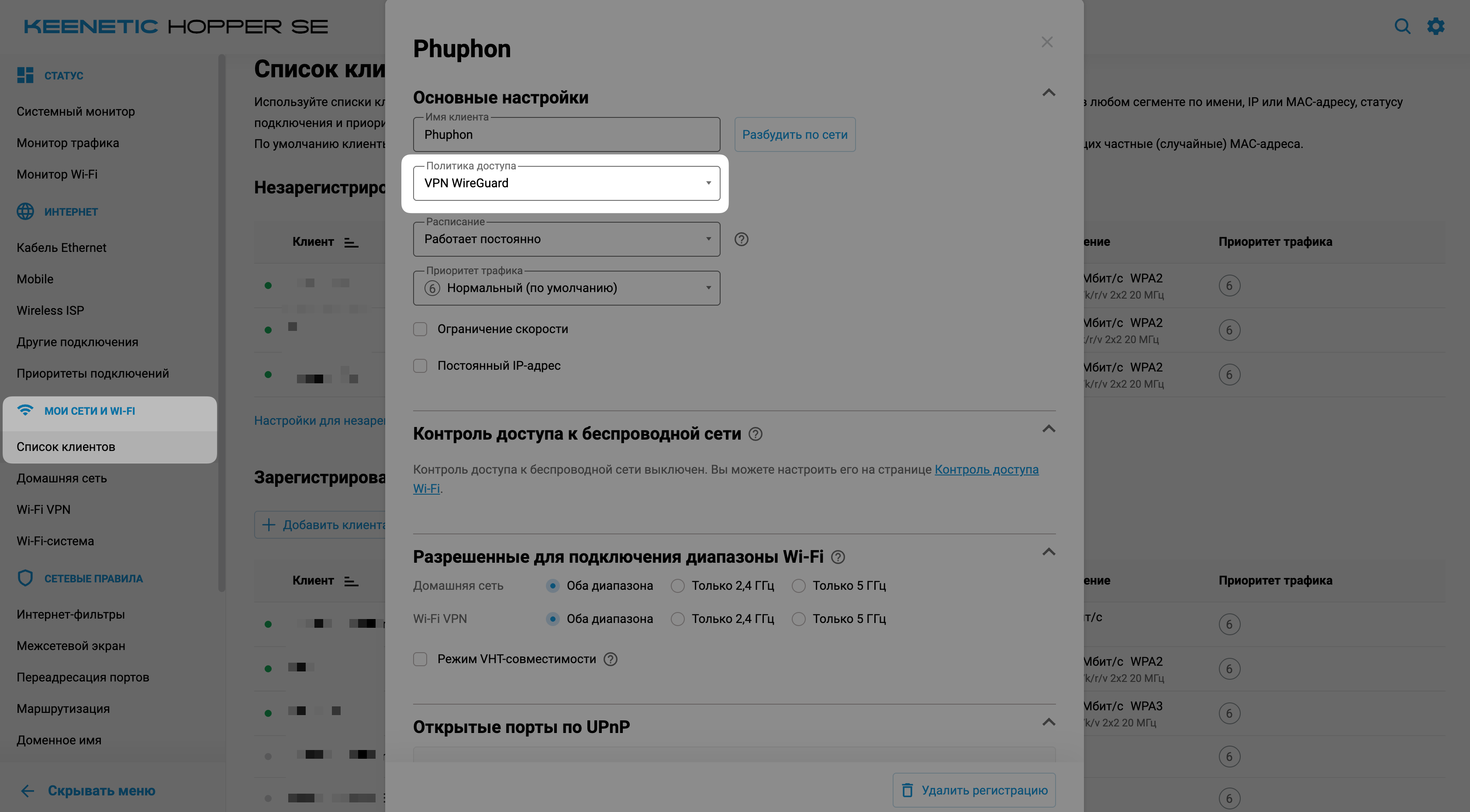 - Откройте список клиентов (устройств), подключённых к роутеру, и убедитесь, что каждое из них использует правильную политику доступа.